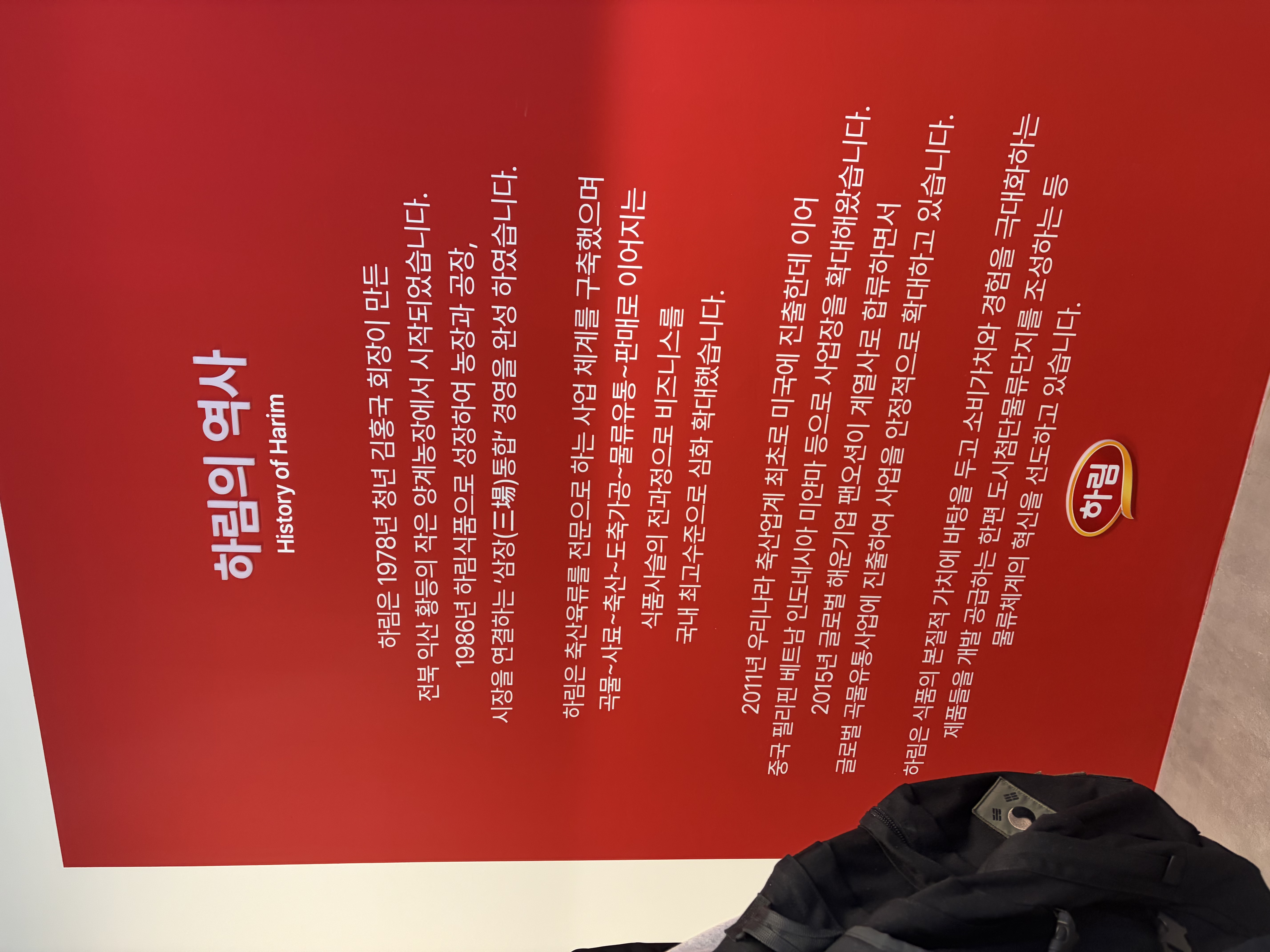 이어 방문한 하림에서는 닭고기 가공 과정 전반과 제품 포장·유통 시스템을 살펴보았습니다. 특히 자동화된 공정과 철저한 위생 관리 절차를 확인하며, 수업에서 배운 내용이 실제 산업에서 어떻게 운영되는지 이해를 넓힐 수 있었습니다.