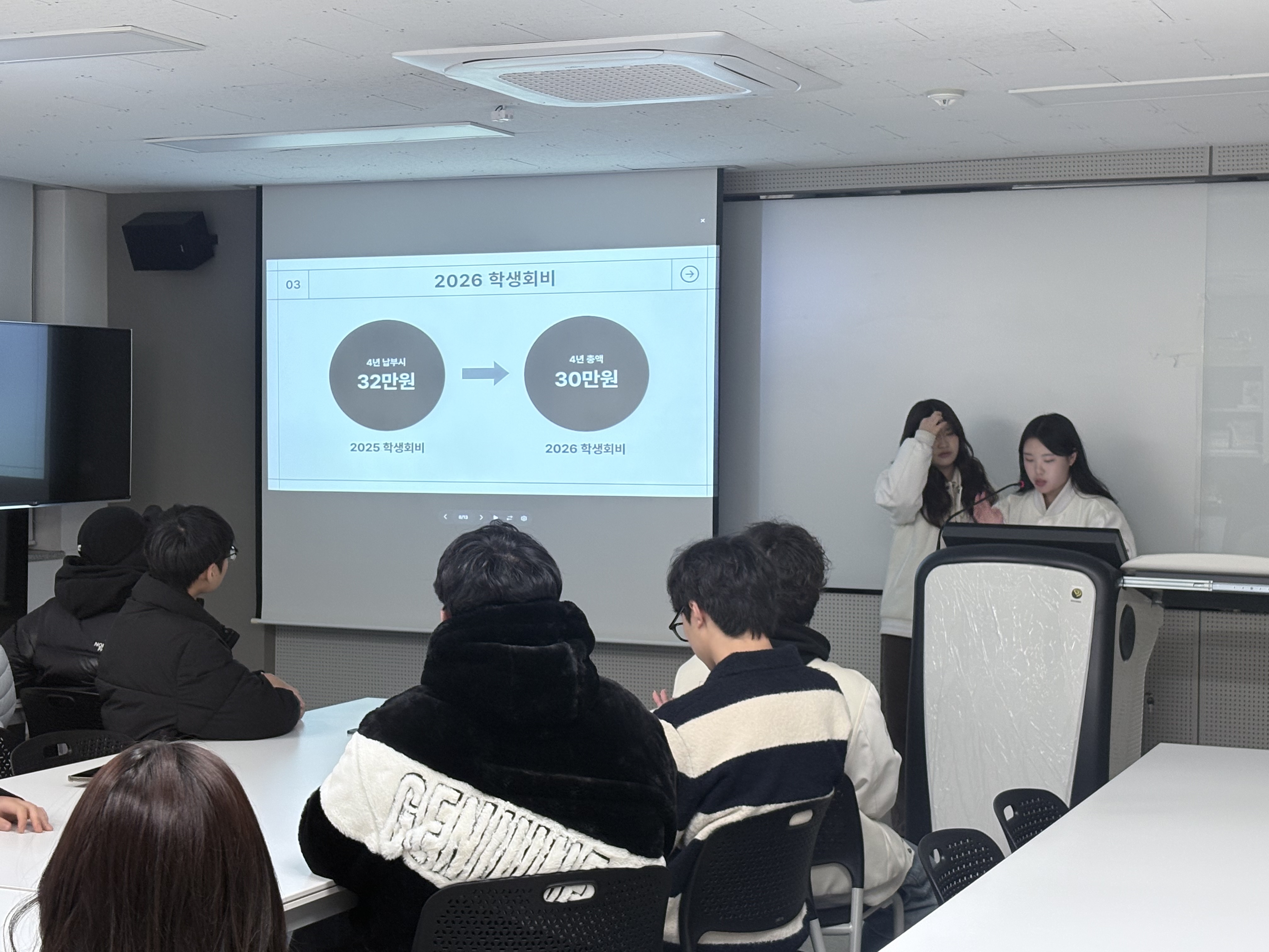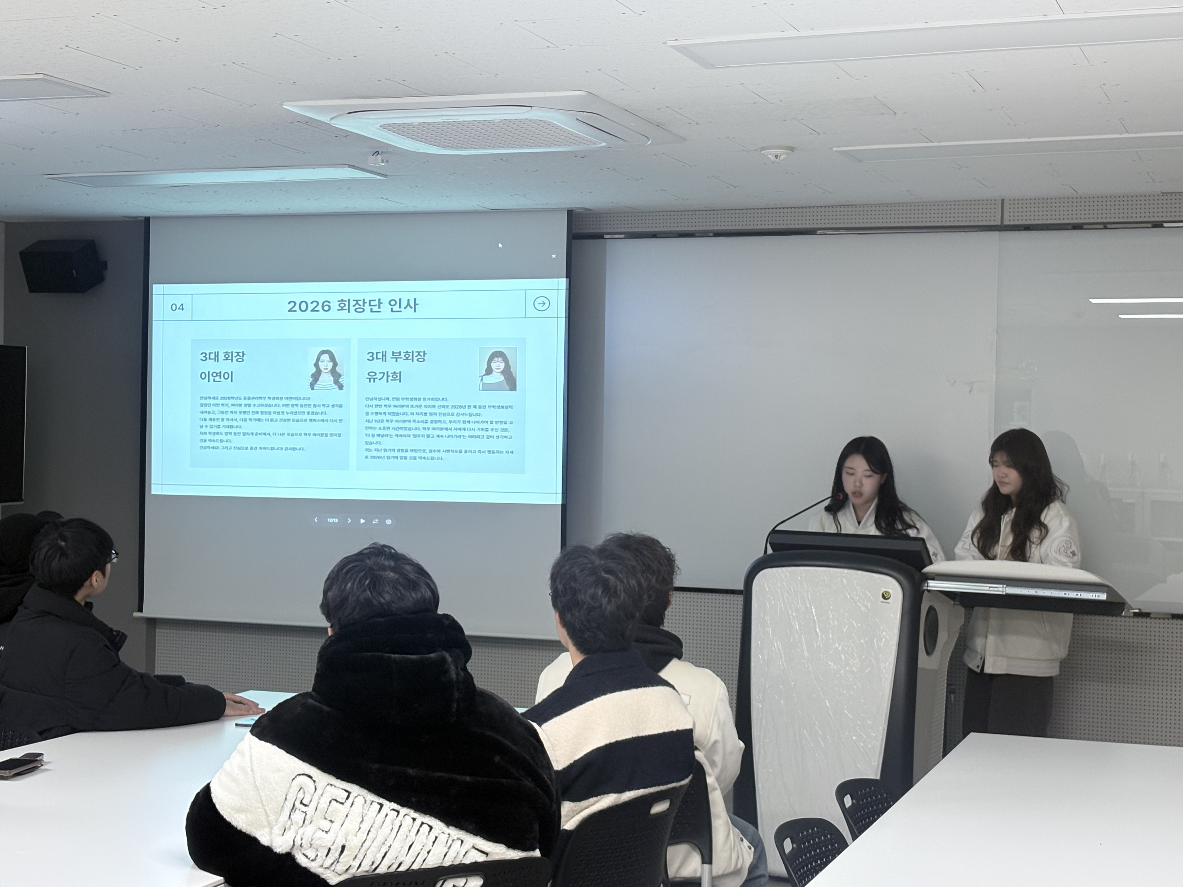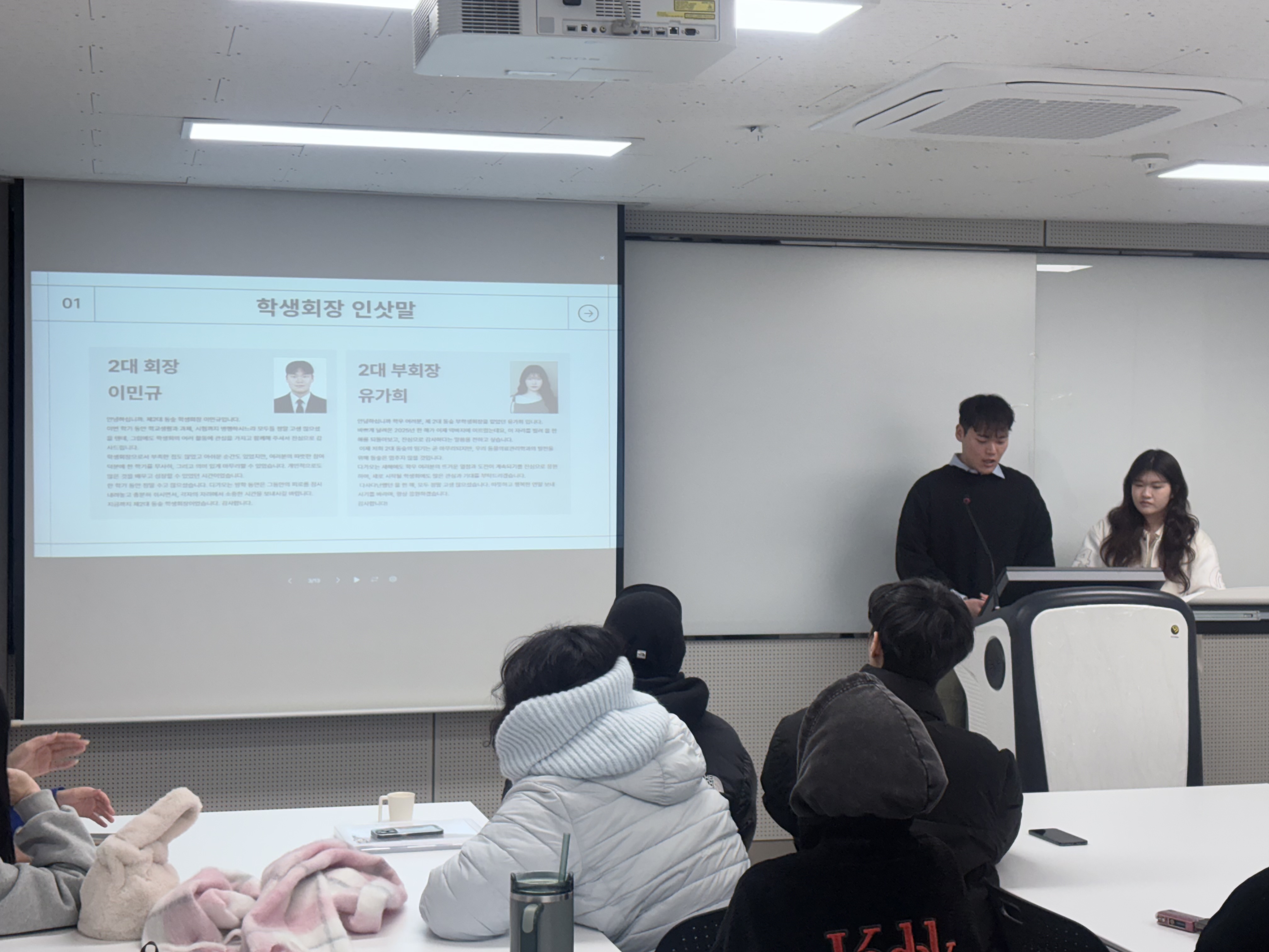 이날 행사에서는 2025년도 학생회장 및 부학생회장의 인사말을 시작으로, 2026년도 학생회장과 부학생회장 소개가 이어져 차기 학생회 구성과 향후 활동 계획을 학생들에게 안내하는 시간이 진행되었습니다.