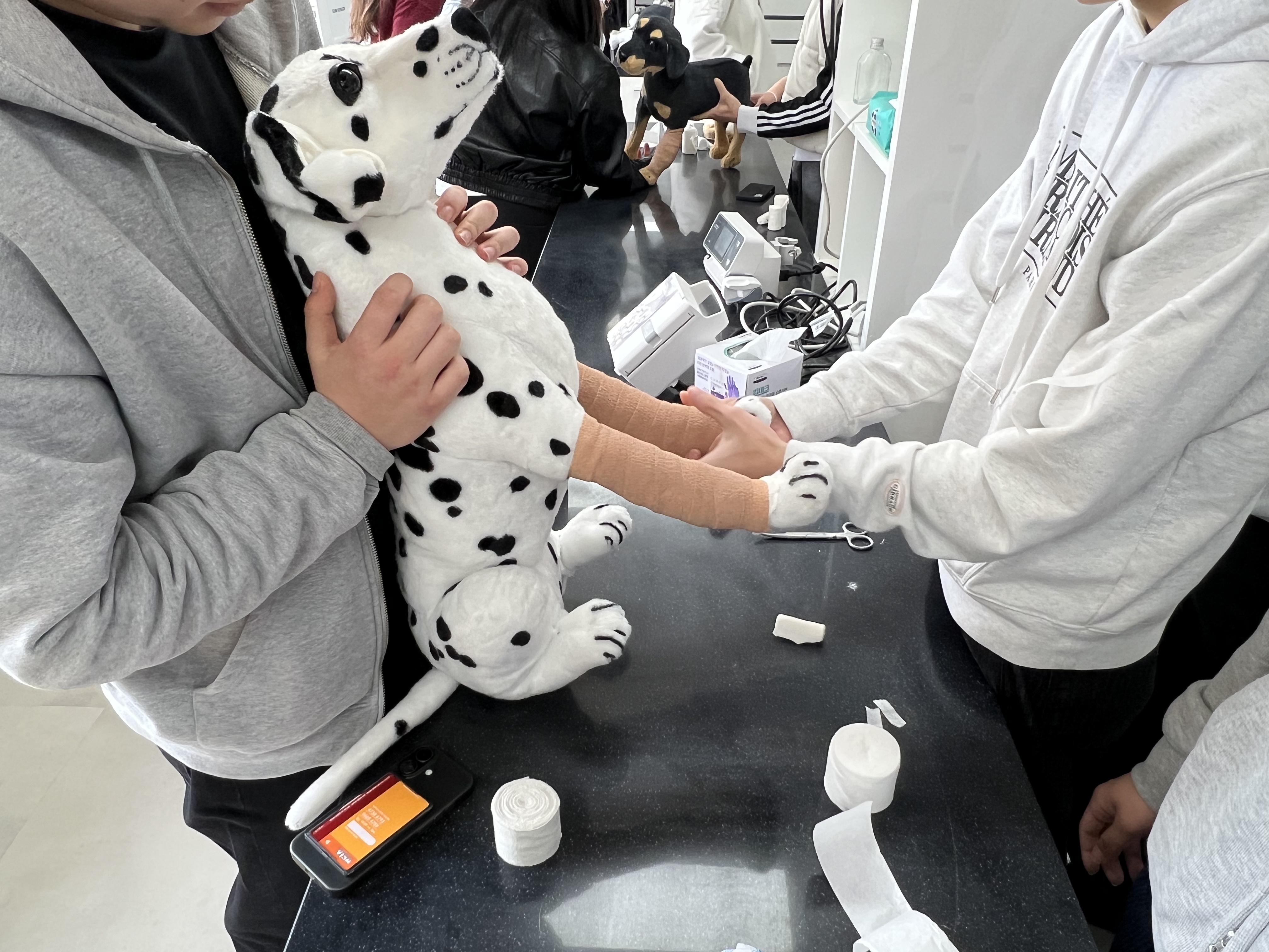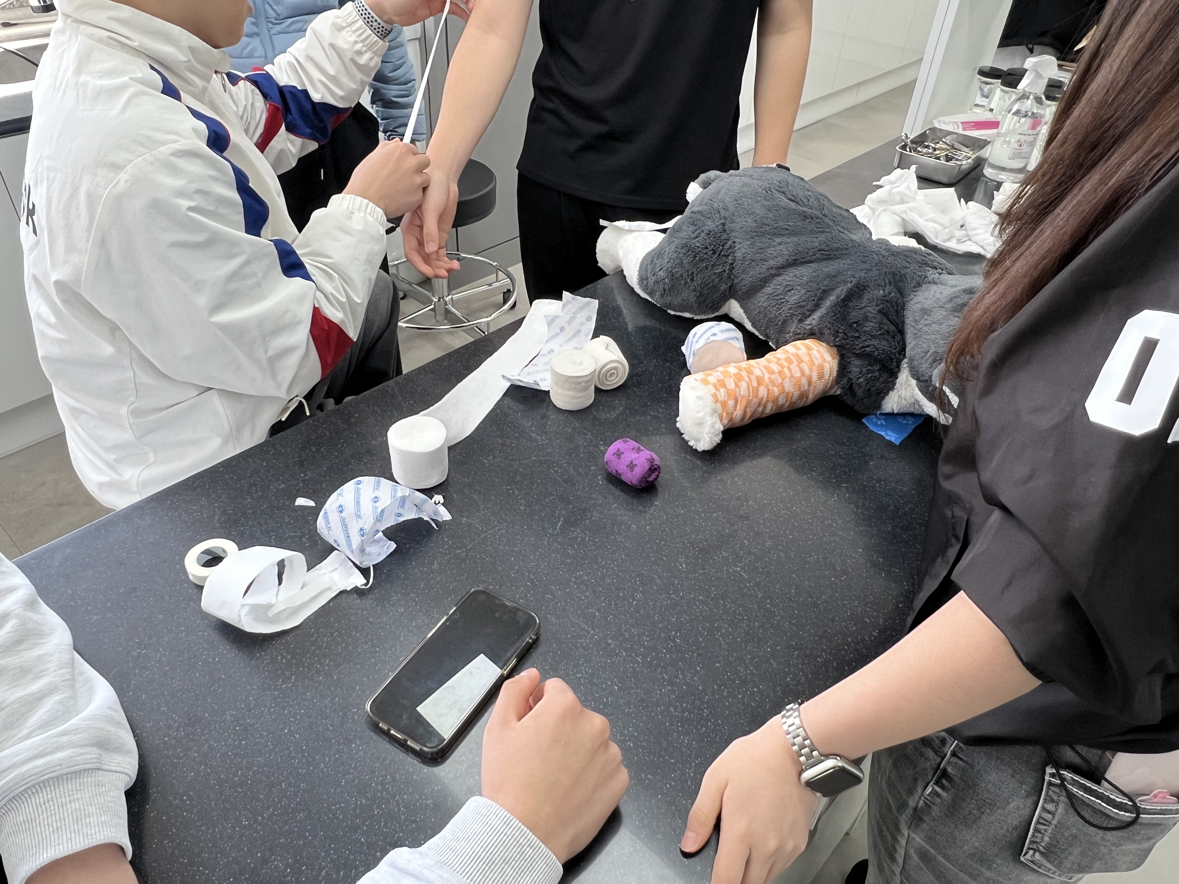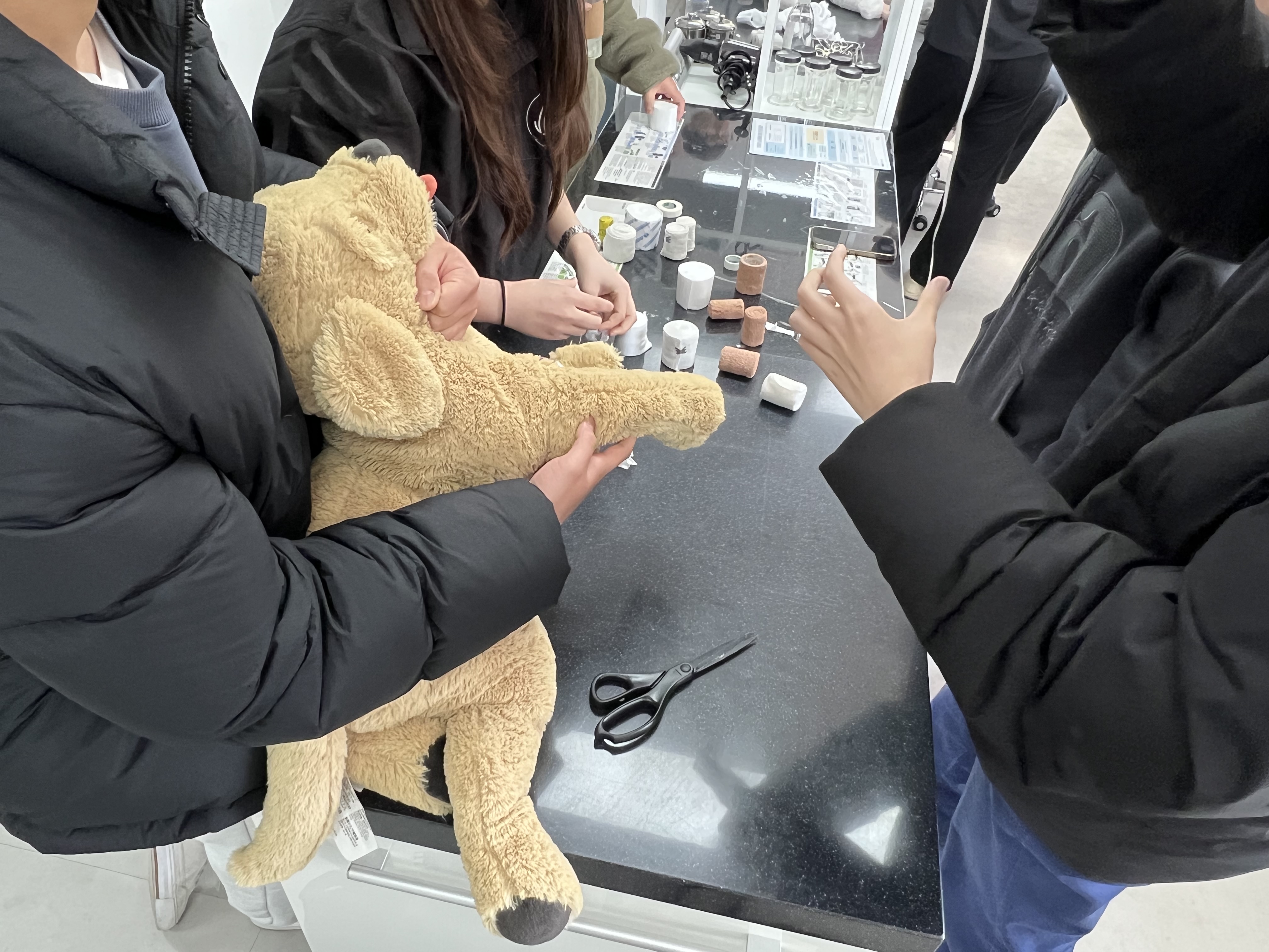 특히 학생들은 밴디지 감기 체험을 통해 실제 동물의료 현장에서 활용되는 기본적인 처치 방법을 직접 경험해보는 시간을 가졌습니다. 이를 통해 이론뿐만 아니라 실습을 통해 직무에 대한 이해를 높일 수 있었습니다.
